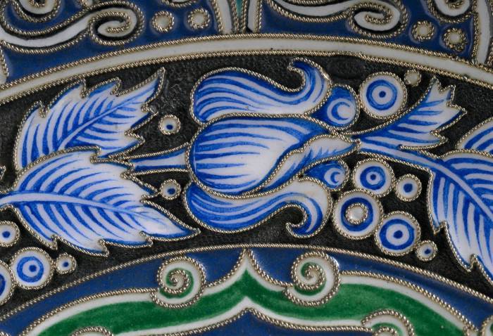 FABERGÉ Rare Art Nouveau-style 88 zolotniks (916 thousandths) silver and polychrome, blue, green and white cloisonné enamel tazza bowl, with five-register tapestry decoration of Greek friezes and scrolls, wavelets and naturalistic plant scrolls, left in reserve on a sand-blasted background; resting on an openwork truncated-conical foot decorated en suite. Very good condition. Moscow, 1899-1908. Goldsmith: Feodor RÜCKERT for Carl Fabergé, supplier to the Imperial Court. Fabergé engraved inventory number: 23087. H. 5.5 x D. 15 cm. Gross weight: 260 g. Related work A similar tazza with an openwork foot, by Feodor Rückert, Moscow, 1908-1917, sold at Sotheby's, New York, November 4, 2010, lot 13 (sold for $31,250).