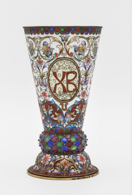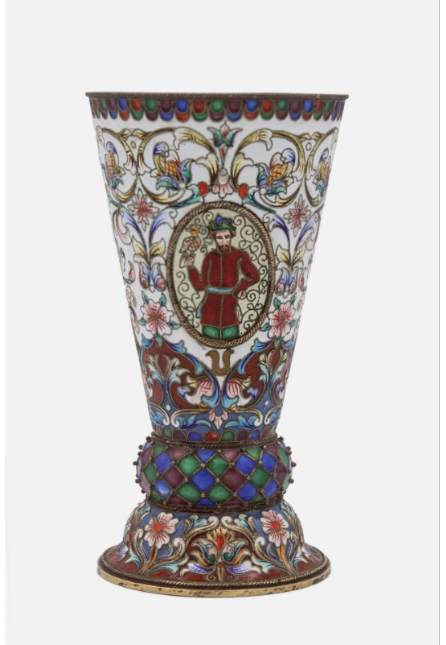 Feodor Ivanovich Rückert (Friedrich Moritz Rückert); (Alsacia, 1840-Moscu, 1918) . Vaso en plata vermeil de 88 zolotnik (916 mm) profusamente decorado con esmalte cloisonné de motivos florales orlando reserva con cetrero y monograma en cirílico (XB). 12,9x7x7 cm. 182 gr. Lig. desperfecto en el esmalte. Marcas del platero y ley de pureza en la base.