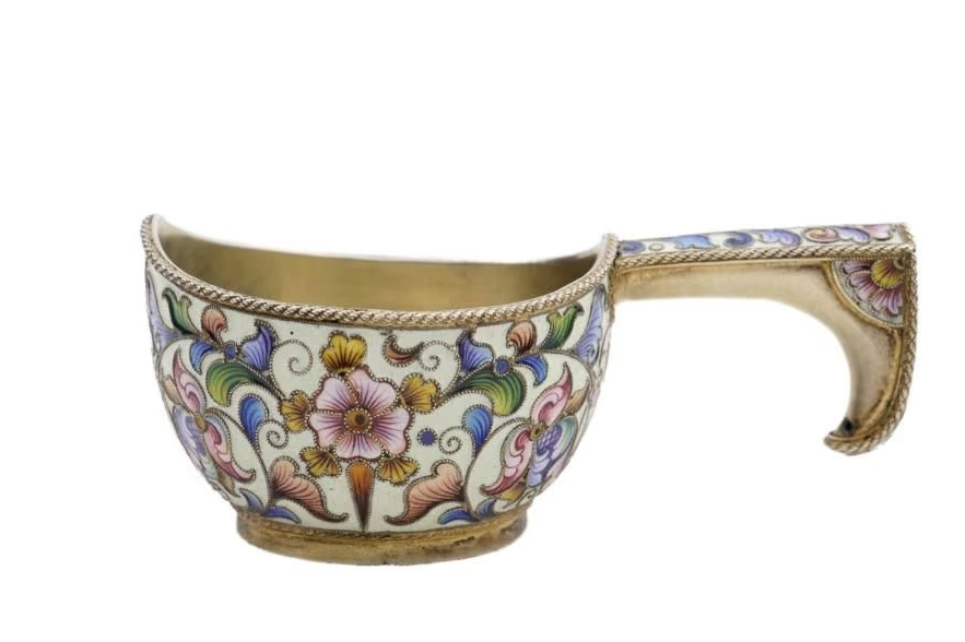 Kovch en vermeil 84 zolotniks (875 millièmes), à décor de rinceaux feuillagés et fleuris en émaux polychromes cloisonnés sur un fond blanc crème, la prise décorée en suit
