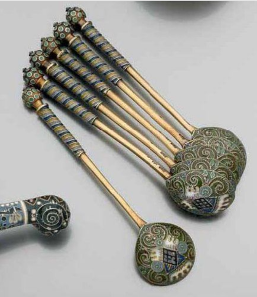 ENSEMBLE DE SIX CUILLERS à thé en vermeil ciselé, émaillé en cloisonné polychrome, le cuilleron présentant au centre un décor d'écusson. MOSCOU, 1908-1917. Travail de l'Orfèvre : Fedor RUCKERT, qui fut chef d'atelier pour Karl FABERGÉ. Poids brut : 144 g Longueur : 10,7 cm.