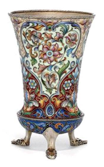 Of flared tapering form on three serpent head feet, sides with shaded polychrome flowers on mint-green, dark red and flesh-pink panels, the base decorated wit trailing flowers in various colours on a blue ground, rope-work borders
