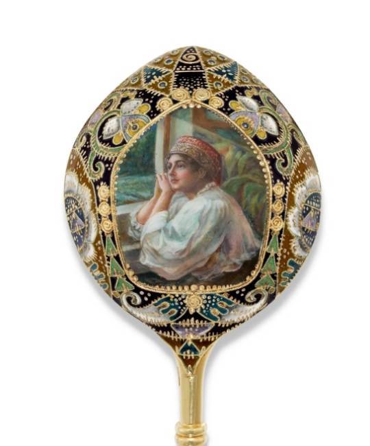 The shaped circular bowl enamelled en plein with a portrait of a young woman in traditional Russian costume sitting by a window, within floral and geometric motifs in shades of green, brown, black and white, the shaped handle decorated with similarly enamelled knobs and a kokoshnik-shaped finial, marked on stem with 'M. Lombardo' in Cyrillic