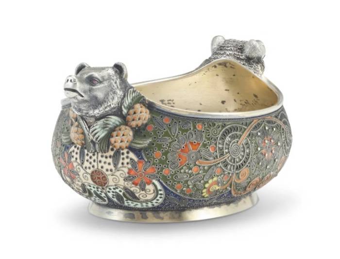 Oval with rounded sides on a spreading foot, the ends with handles in the form of bear heads, their eyes set with small cabochon rubies, the body with filigree flowers and foliate scrolls enameled in dark green, blue, white, orange, and yellow, marked on underside with maker's initials