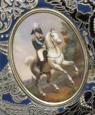 Эта коробка посвящена столетию вторжения Наполеона в Россию, в частности, Бородинского сражения (7 сентября 1812 года), в котором, несмотря на поражение русских, французы понесли неподъемные потери. Один из овальных медальонов на крышке повторяет, в обратном направлении, конный портрет царя Александра I (1837) Франца Крюгера (нем. 1797-1857), который сейчас находится в Военной галерее в Зимнем дворце.
