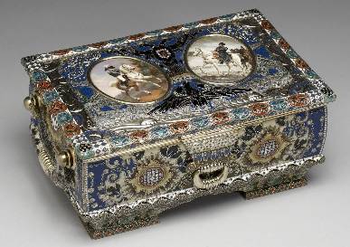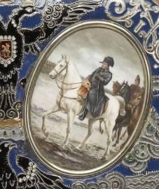 Эта коробка посвящена столетию вторжения Наполеона в Россию, в частности, Бородинского сражения (7 сентября 1812 года), в котором, несмотря на поражение русских, французы понесли неподъемные потери. Один из овальных медальонов на крышке повторяет, в обратном направлении, конный портрет царя Александра I (1837) Франца Крюгера (нем. 1797-1857), который сейчас находится в Военной галерее в Зимнем дворце. На другой изображена деталь, также перевернутая, из картины Ж.Л.Э. Мейссонье «Поход во Францию» (1864), известной в народе как «Отступление из Москвы», находящейся в Лувре в Париже