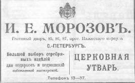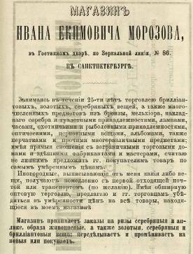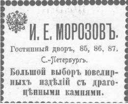 Торговый дом «И.Е. Морозовъ» является крупнейшей ювелирной и золото-серебряной фирмой-магазином дореволюционного Петербурга. Основал именную фирму в 1849 году Иван Екимович Морозов, золотых дел мастер, купец первой гильдии, благодаря своему делу впоследствии ставший потомственным почетным гражданином. Торговому дому, уютно расположившемуся в Гостином дворе, принадлежала собственная ювелирная мастерская и специализированная мастерская по производству серебряных изделий в Загородном проезде 14.
