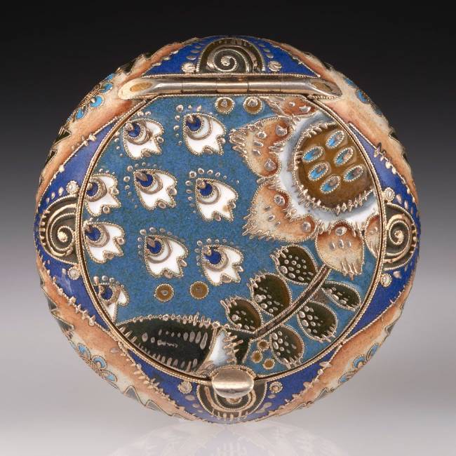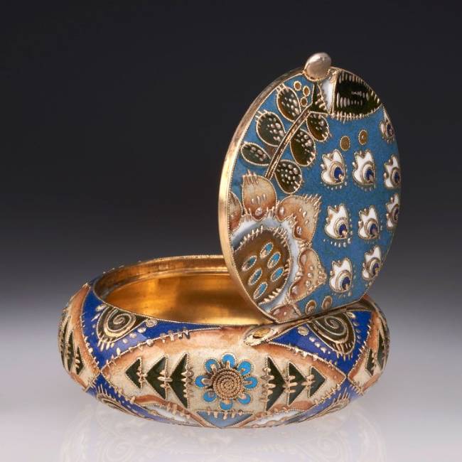 Feodor Rückert, shaded cloisonné enamel pill or pastille box retailed by the firm of Gashkel and Shik (St. Petersburg), Moscow, Russia, 1908–1917
