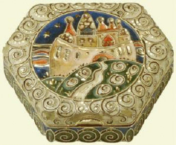 Feodor Ruckert, who made this box, was Faberge's main enamellist in the Russian style. He began an association with Faberge at the time of the opening of the Moscow branch in 1887 but he also worked for other jewellery and silversmiths businesses in Moscow, such as Khlebnikov and Ovchinnikov. According to Anne Odom, most of the pieces which Ruckert produced for Faberge were made after 1908, by which time the colours of his enamelling had changed from pastels to dark blues, greens, greys and browns and he began to use intricate wirework patterns in his cloisonné enamelling, particularly in coils, as seen on this box. The scene on this box is from the Tale of Tsar Sultan, taken from a poem by Alexander Pushkin (17991837), and depicts the walled city which miraculously appeared to Tsar Sultan's wife and his son, Prince Gvidon.