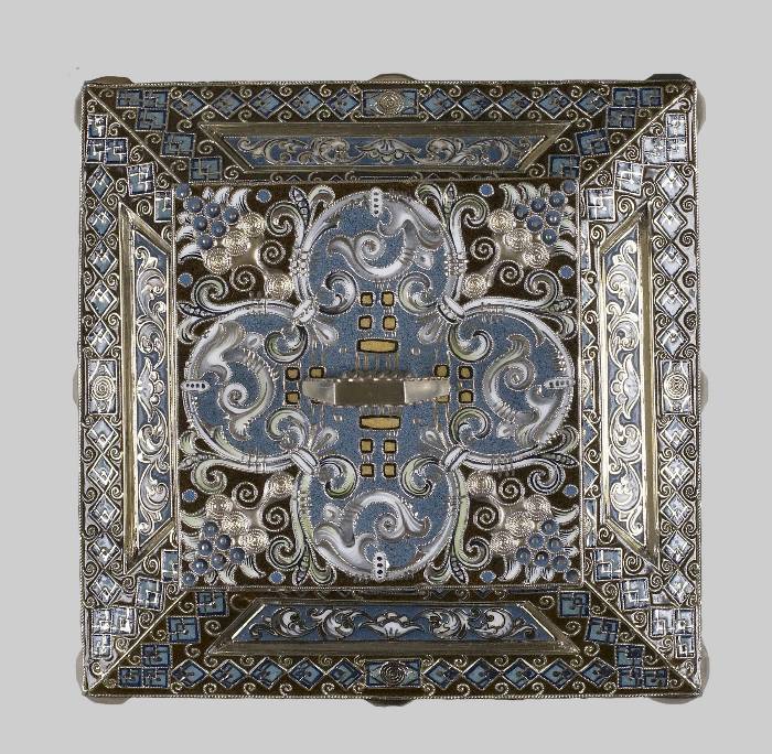 The caddy, with its sloping decks and elevated top, recalls in shape a 17th-century teremok. Four crowned Sirins are depicted within pale blue circles on each of its sides. The remaining ornament consists of scrolls and geometric patterns in brown and grey-green against dark blue. Characteristic of Rückert's designs after 1908 are the tightly wound wire spirals appearing in sets of six on each face of the caddy.
