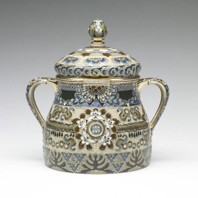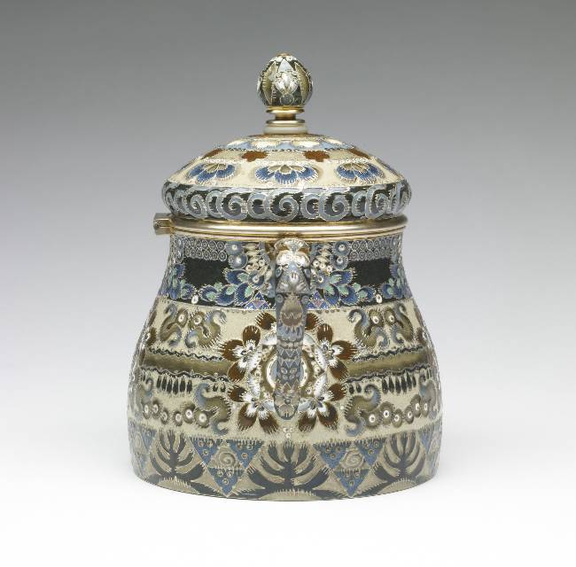 The three pieces of this coffee service have similar decoration in Fedor Rückert's most subdued style. Highly abstract botanical motifs, including cloud berries, pine trees, and garlands, are rendered in his low-keyed palette of deep and pale olive, beige, brown, violet, deep and pale blue, and some white. To allow for the extra height of the coffee pot, an extra band of blue seed pods and olive colored leaves has been added at the bottom. Ivory rings provide insulation for the handles and top knobs.