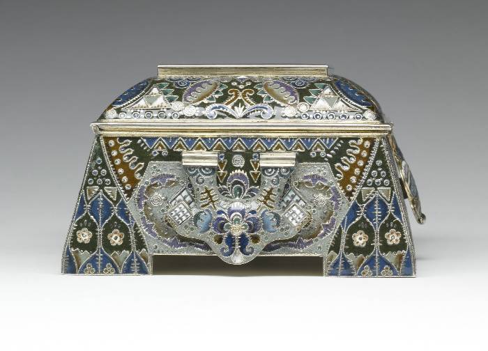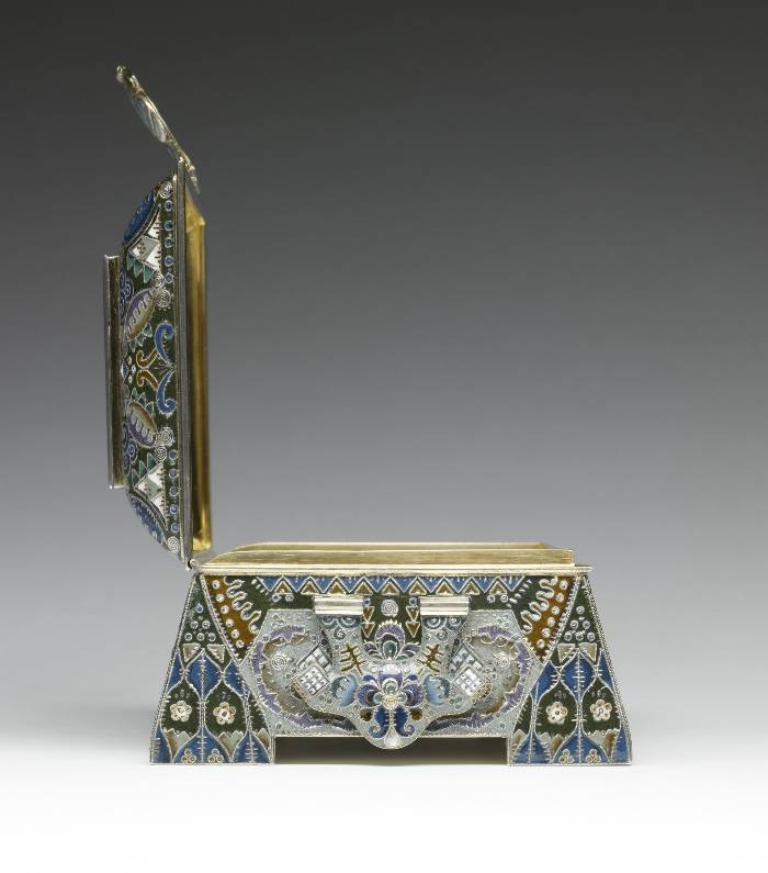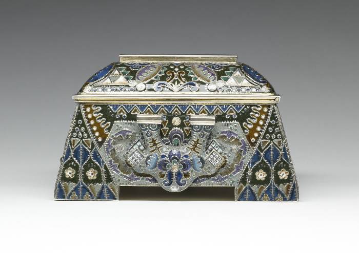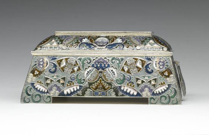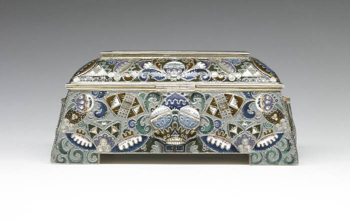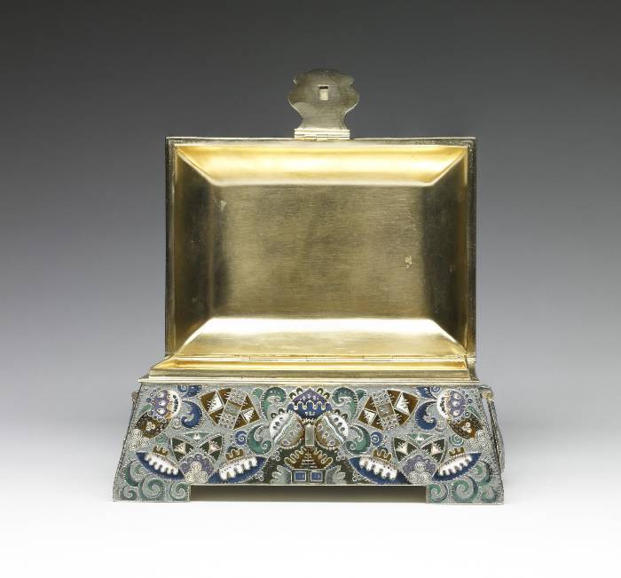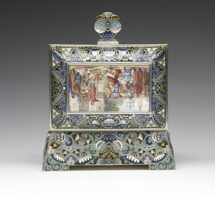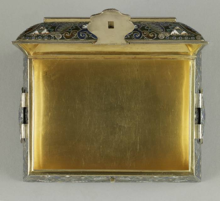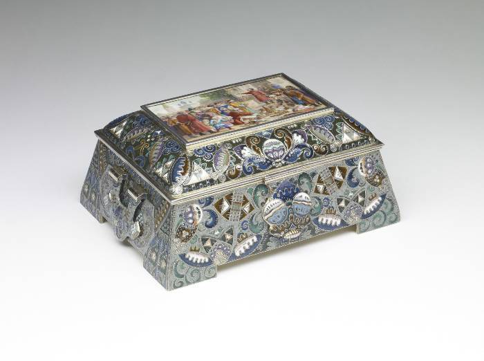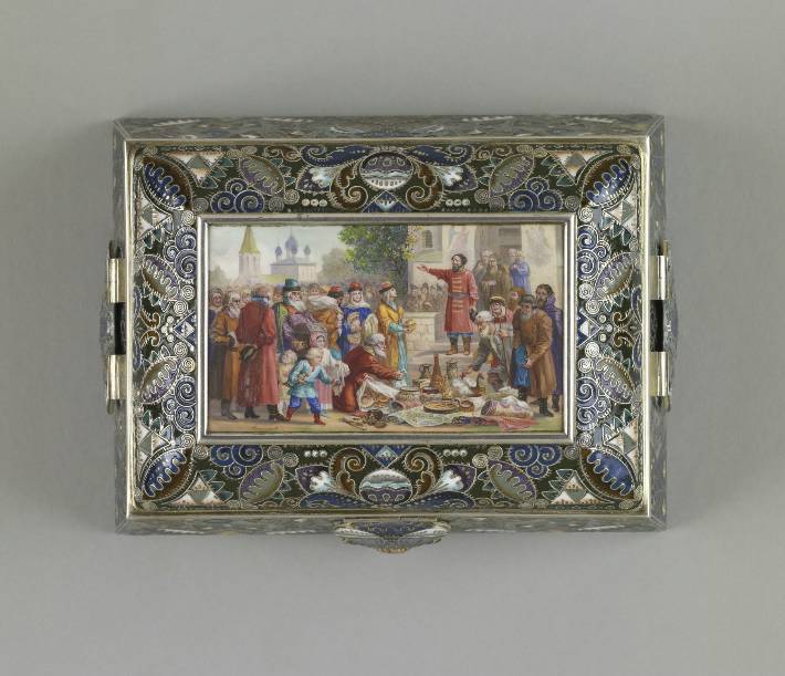 Portrayed is an event that had occurred during Russia's "Time of Troubles" in the early 17th century. The merchant Kuzma Minin stands in the town square exhorting the citizens of Nizhnii Novgorod to donate their valuables in order to finance a volunteer army. Even the children in the foreground are surrendering their toys. Led by Prince Dmitrii Pozharskii (1577-1642), the army expelled the Poles from Moscow in August, 1612. The victory resulted in Michael Romanov being elected tsar the following year, thereby founding the Romanov dynasty. This box was probably intended to commemorate the Tercentenary of the dynasty in 1913. The outward flaring sides of the box are decorated in painted enamel with patterns of cloud berries and curvilinear motifs as well as with tightly wound filigree and distinctive hatch marks.