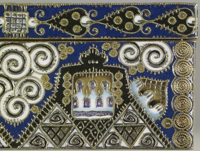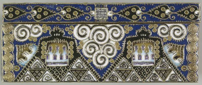 The miniature, in matte enamel, reproduces Blind Man's Bluff, a popular painting by Konstantin Makovskii (1839-1915). In a teremok interior, a child and an older boy waving a peacock feather encourage a blindfolded young lady dressed in white while her companions seek to elude her. Incidental details include a mother seated with her child and companion, and a child stealing fruit from the table. The vaulted chamber is replete with scrolls of vine painted on the ceiling and with such furnishings as a large white tile stove, an icon, and a commode. The Kremlin Terem, restored after the designs of Fyodor Solntsev (1801-1892) in 1837, served as the prototype for the interior. This box exemplifies Fedor Rückert's late style of painted filigree work in which ample use is made of decorative, filigree wire spirals and muted colors. In this work, they are predominantly dark blue, black, brown, and white.
