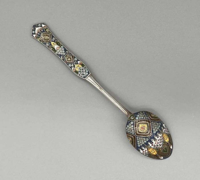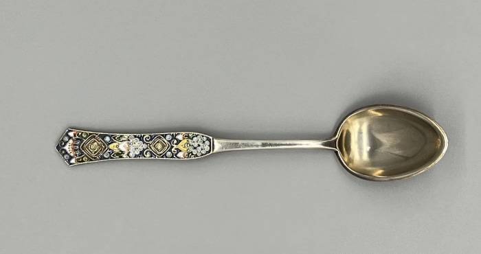 Серебро, эмаль по скани, амальгама, штамп, монтировка, золочение. Дл. 14,5 см, ш. чашечки 2,6 см.
