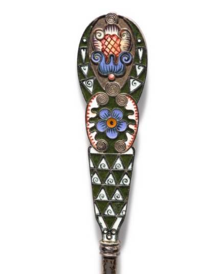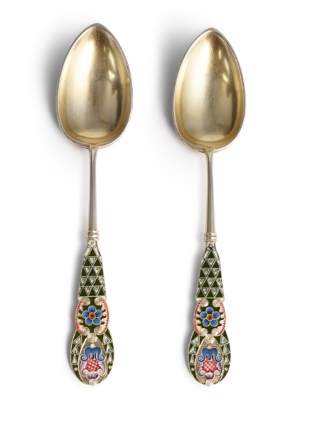 A Pair of Silver-Gilt and Cloisonné Enamel Spoons, Workmaster Fedor Rückert, Moscow, 1908-1917